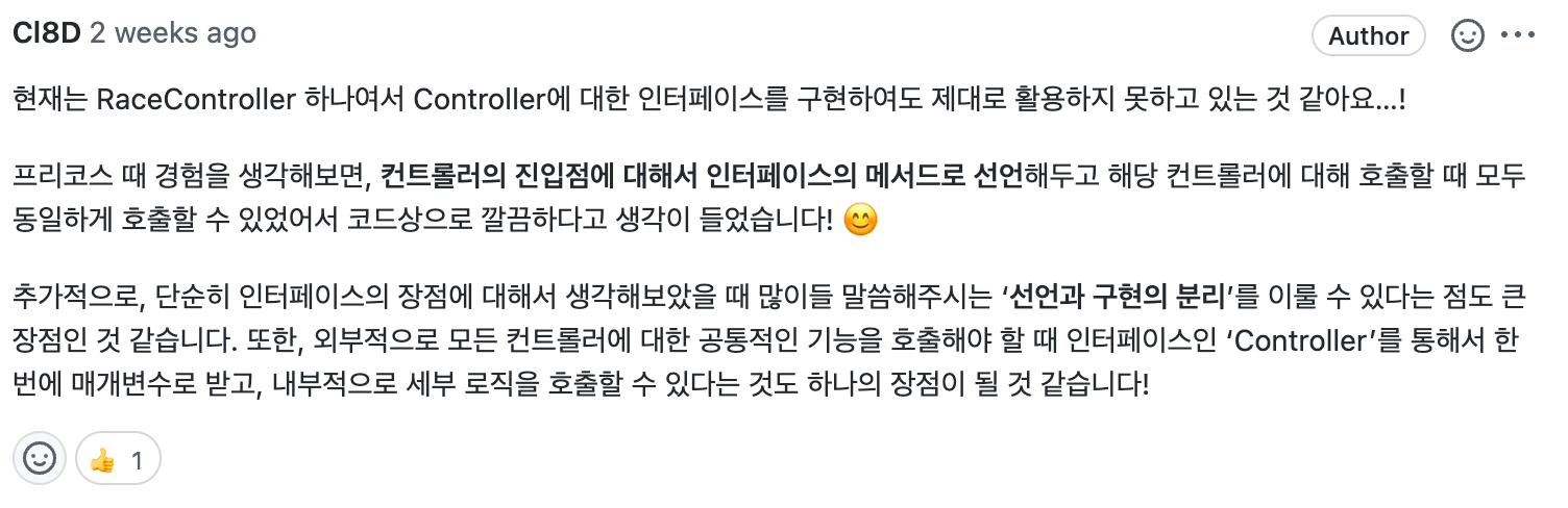 ๋น์ ์ปจํธ๋กค๋ฌ์ ๋ํ ์ธํฐํ์ด์ค๋ฅผ ๊ตฌํํ์๋๋ฐ, ์ฌ์ค ์ปจํธ๋กค๋ฌ๊ฐ ํ๋์ฌ์ ๊ต์ฅํ ๋ฌด์๋ฏธํ๋ค. ใ ใ ๊ทธ๋์ ๋ค์ ๋ฆฌํฉํฐ๋ง ๋ ๊ณผ๊ฐํ๊ฒ ์ญ์ ํ์๋ค. ์ญ์ ํ๋ ๊ฒธ ์ธํฐํ์ด์ค์ ๋ํด์ ๊ณต๋ถ๋ฅผ ํ์๋๋ฐ, ๊ทธ ๋ด์ฉ์ ๋ธ๋ก๊ทธ์ ์ ๋ฆฌํ๋ฉด ์ข์ ๊ฒ ๊ฐ์์ ์ฌ๊ธฐ์ ์ ์ด๋๋ค.