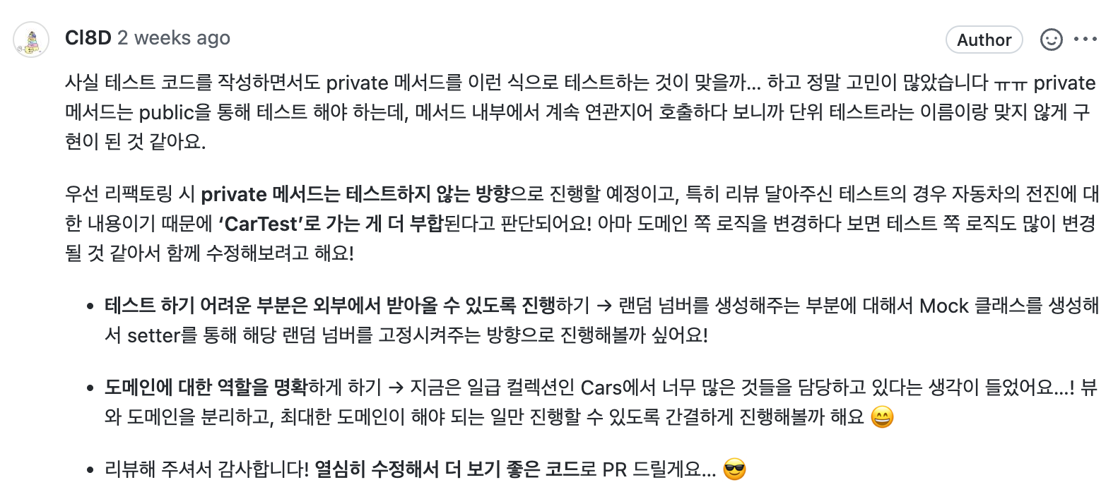 ์ถ๊ฐ์ ์ผ๋ก, ์์๊ฐ ํฌ์ฅ์ ์ํด์ ์ฐจ ์ด๋ฆ ์ญ์ ๋ณ๋๋ก ๋ถ๋ฆฌํ์ฌ ํฌ์ฅํด์ validation์ ํด๋น ํฌ์ฅ ํด๋์ค์์ ์งํํ๋๋ก ํด์ ๋๋ฉ์ธ์ ๋ํ ์ญํ ์ ์ค์ด๋ ๋ฐฉํฅ์ผ๋ก ์ค๊ณํด๋ณด๊ณ ์ ํฉ๋๋ค! (์ถํ ํ๋๊ฐ ์ถ๊ฐ๋๊ณ , ์ ์ฝ ์ฌํญ์ด ์ถ๊ฐ๋๋ฉด Car ๋๋ฉ์ธ ํ๋์์ ๋๋ฌด ๋ง์ ์ญํ ์ ํ ๊ฒ ๊ฐ๋ค๋ ์๊ฐ์ด ๋ค์์ต๋๋ค :D)