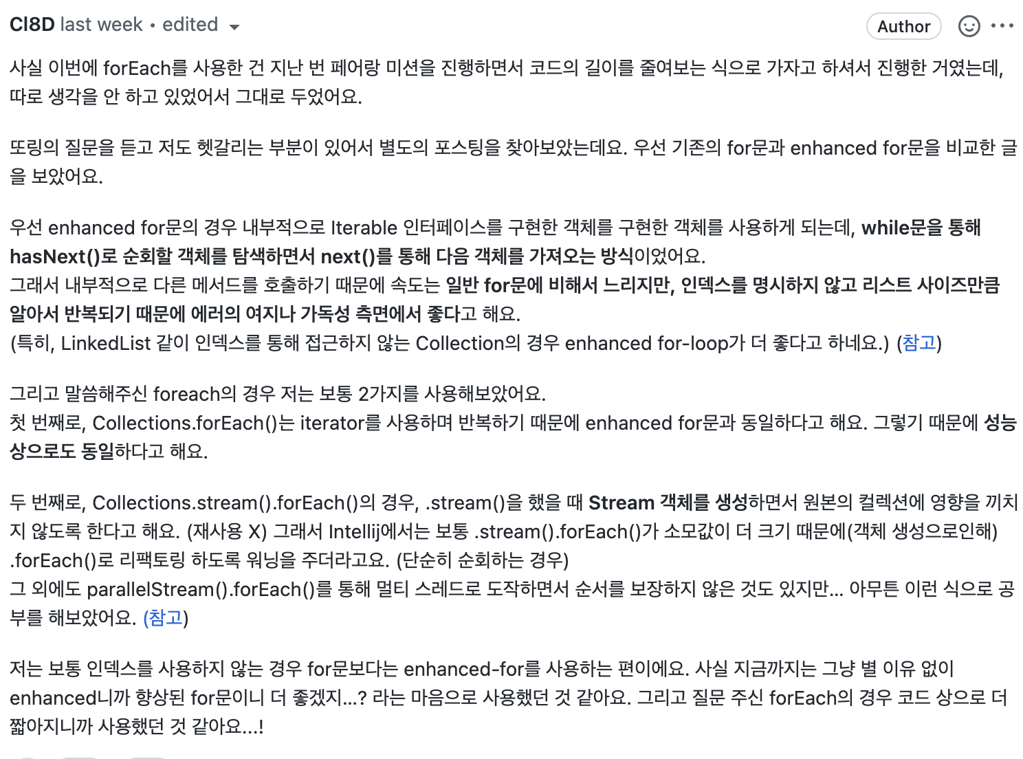 ๋ด๋ถ์์ iterator๋ฅผ ์ฌ์ฉํด์ ๊ฐ์ ๊ฐ์ ธ์จ๋ค๋ ์ ๊ณผ, for-each๊ฐ ์ผ๋ฐ for์ ๋นํด์ ๋๋ฆฌ๋ค๋ ๊ฒ์ ์ฒ์ ์์๋ค ๐ซข ๋ํ, Collections.forEach ์ญ์ iterator๋ฅผ ์ฌ์ฉํ๋ฉฐ ๋ฐ๋ณตํ๊ธฐ ๋๋ฌธ์, enhanced for๋ฌธ๊ณผ ๋์ผํ๊ณ , ์ฑ๋ฅ์์ผ๋ก ๋์ผํ๋ค๊ณ ํ๋ค! (Stream์ด๋ผ์ ๋ ๋๋ฆด ์ค ์์๋๋ฐ ์๋์๋ค...) ์ด๋ ๊ฒ ๋ ๋ฐฐ์ธ ์ ์์๋ค.
