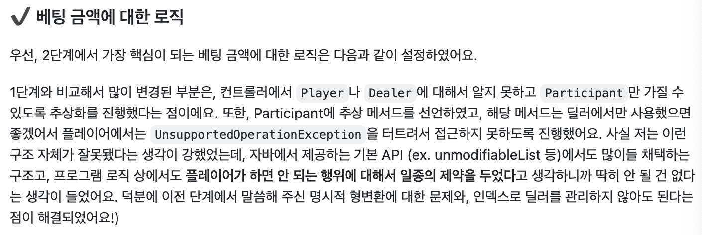 ์ฌ์ค ์๋ฐ API์ ๋น๊ตํ๋ ๊ฑด ๋ง์ง ์์ ์์์ด๊ธด ํ๋ค. ๋ด๊ฐ ์ค๊ณํ ๊ฒ์ ํธํ์ฑ ๋๋ฌธ์ ์ด๋ ๊ฒ ์์ฑํ๋ค๊ธฐ๋ณด๋ค๋, ์ด๋ป๊ฒ๋ Participant์ Dealer๋ฅผ ๋ผ์๋ง์ถ๊ธฐ ์ํด์ ์์ฑํ ์ฝ๋์ ๋ค๋ฆ์๊ธฐ ๋๋ฌธ์ด๋ค.