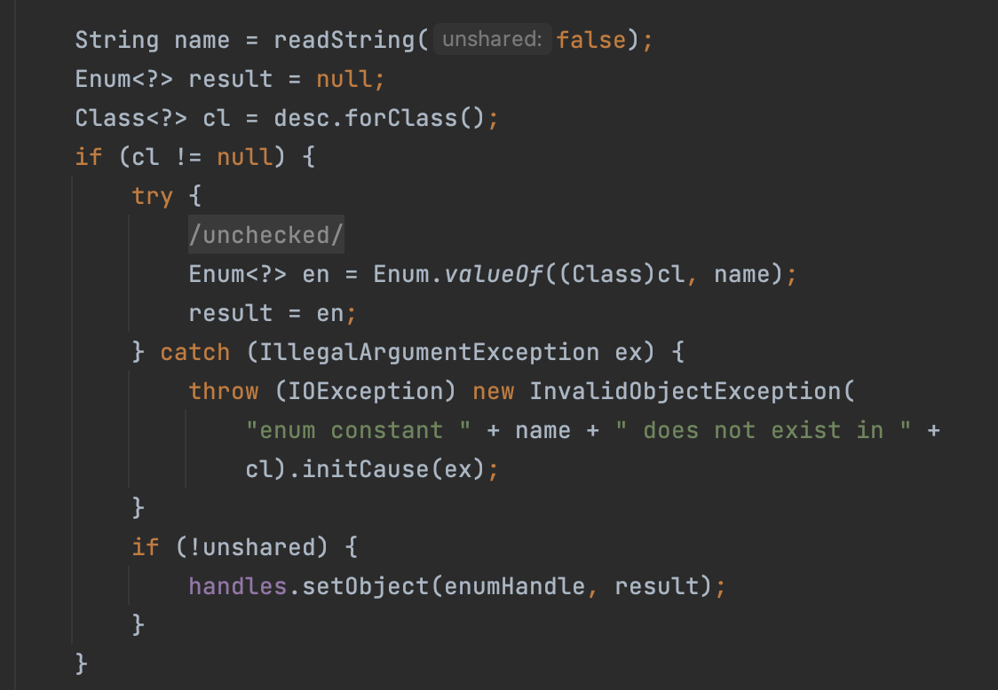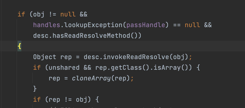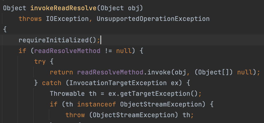 ๋ค์ด๊ฐ ๋ณด๋ฉด ๋ค์๊ณผ ๊ฐ์ด readResolve() ๋ฉ์๋๊ฐ ์๋์ง ํ์ธ์ ํ๊ณ , ์กด์ฌํ๋ ๊ฒฝ์ฐ์ invoke๋ฅผ ํตํด์ ํธ์ถํด์ฃผ๋ ๊ฒ์ ๋ณผ ์ ์๋ค.์ค์ ๋ก invokeReadResolve() ๋ฉ์๋๋ฅผ ๋ณด๋ฉด ์๋์ ๊ฐ๋ค. (์ด๋์ ๋ฉ์๋์ ๋ค์ด๋ฐ์ด ์ค์ํ๋ค๋ ๊ฒ์ ๋ค์ ๊นจ๋ซ๋๋ค ๐)