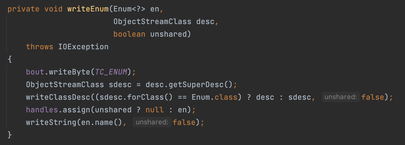 ๋ด๋ถ์ ์ผ๋ก en.name()์ ํตํด์ writeString์ ํ๋ ๊ฒ์ ๋ณผ ์ ์๋ค!