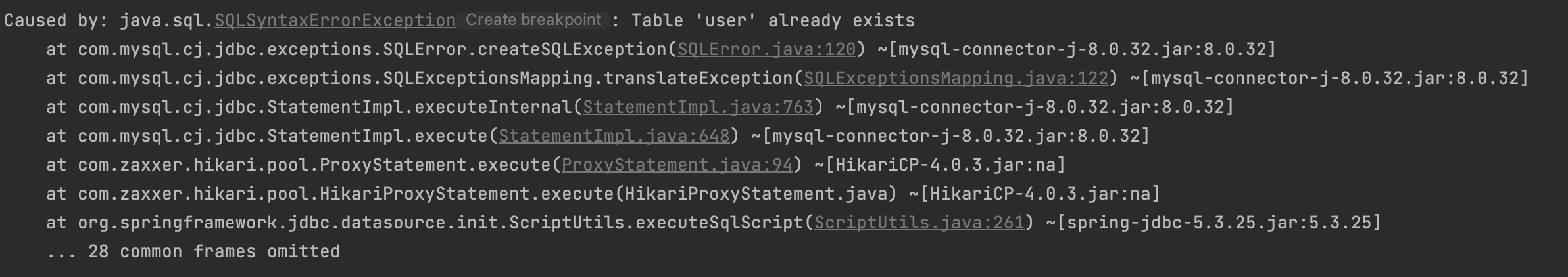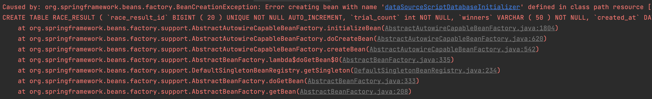 Caused by: org.springframework.beans.factory.BeanCreationException: Error creating bean with name 'dataSourceScriptDatabaseInitializer' defined in class path resource [org/springframework/boot/autoconfigure/sql/init/DataSourceInitializationConfiguration.class]: Invocation of init method failed; nested exception is org.springframework.jdbc.datasource.init.ScriptStatementFailedException: Failed to execute SQL script statement #1 of URL [file:/Users/jw/Documents/wooteco/level2/jwp-racingcar/build/resources/main/data.sql]: CREATE TABLE RACE_RESULT ( `race_result_id` BIGINT ( 20 ) UNIQUE NOT NULL AUTO_INCREMENT, `trial_count` int NOT NULL, `winners` VARCHAR ( 50 ) NOT NULL, `created_at` DATETIME NOT NULL default current_timestamp, PRIMARY KEY ( `race_result_id` ) ) ENGINE=InnoDB DEFAULT CHARSET=utf8mb4 COLLATE =utf8mb4_general_ci; nested exception is org.h2.jdbc.JdbcSQLSyntaxErrorException: Table "RACE_RESULT" already exists; SQL statement: