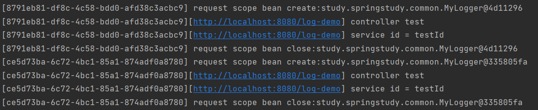 System.out.println("[" + uuid + "] request scope bean create:" + this);