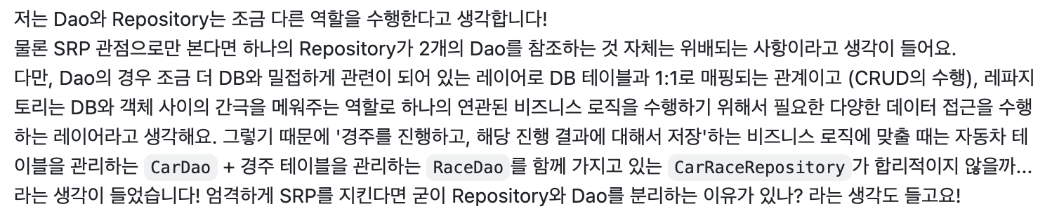 DAO์ ๊ฒฝ์ฐ 1:1 ๋งคํ์ด ๋์ง๋ง, Repository์ ๊ฒฝ์ฐ Dao๋ฅผ ํฉ์ณ ์กฐ๊ธ ๋ ๋น์ฆ๋์ค ๋ก์ง ๊ด์ ์์ ์ฌ์ฉํ๋ ๊ณ์ธต์ด๋ผ๊ณ ์๊ฐํ๋ค.