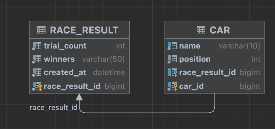 ์๋๋ ์๋์ฐจ์ ๋ํด ์ ์ฅํ๋ ํ ์ด๋ธ์ด๊ณ , ์๋์ฐจ ์ด๋ฆ๊ณผ ์์น, ๊ทธ๋ฆฌ๊ณ ์ธ๋ํค๋ก ๊ฒฝ์ฃผ ๊ฒฐ๊ณผ์ ๋ํ ์์ด๋๋ฅผ ๊ฐ์ก๋ค.