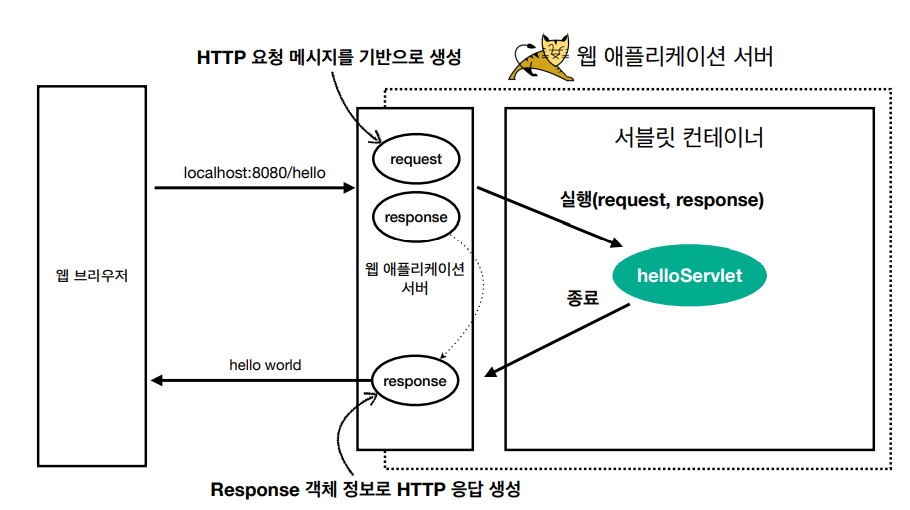 : ์๋ธ๋ฆฟ ์ปจํ ์ด๋๋ ์๋ธ๋ฆฟ ๊ฐ์ฒด (HelloServlet)๋ฅผ ์์ฑ ๋ฐ ํธ์ถ, ๊ทธ๋ฆฌ๊ณ ์๋ช ์ฃผ๊ธฐ ๊ด๋ฆฌ๋ฅผ ํด์ค๋ค.