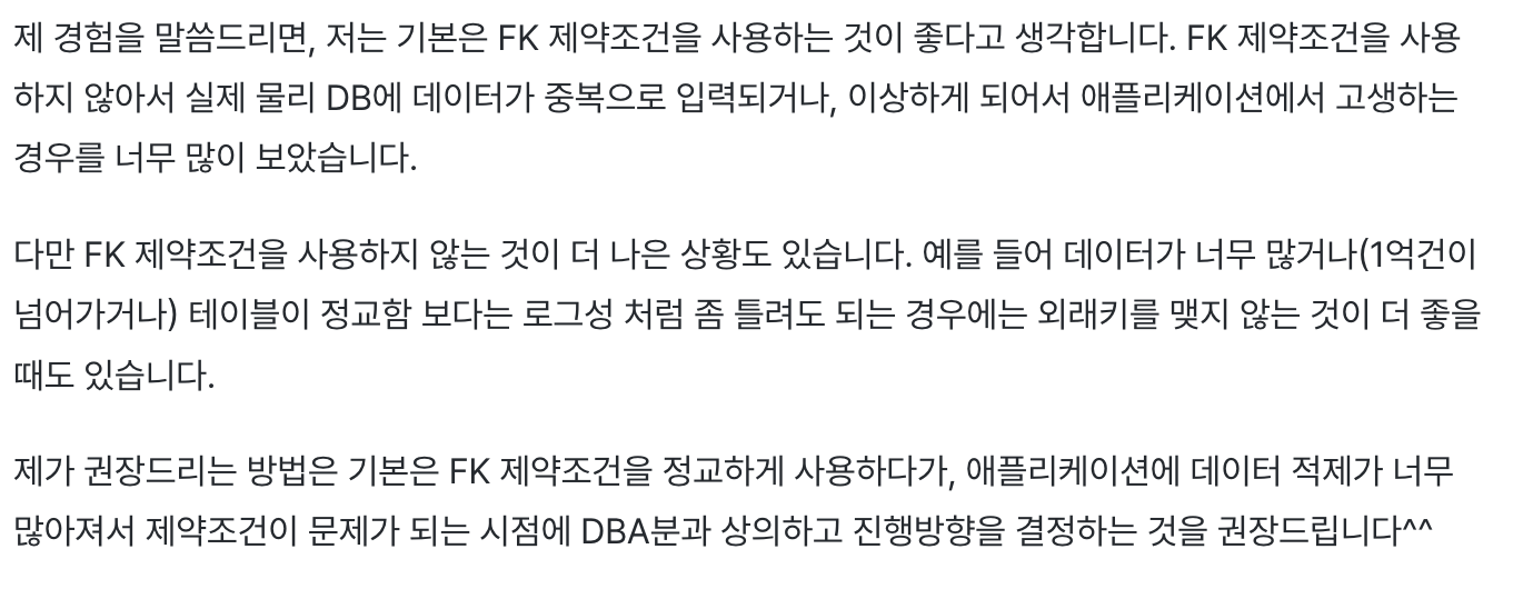 ์์ ํ ์ด๋ธ์ INSERT ์ฐ์ฐ ์์ ๋ถ๋ชจ ํ ์ด๋ธ๋ ํ์ธํด์ผ ํ๊ณ , ๋ณ๊ฒฝ ์์๋ ๊ณ ๋ คํด์ผ ํ ์ ์ด ๋ง๊ณ , ํ ์คํธํ๊ธฐ๋ ์ด๋ ต๊ธฐ ๋๋ฌธ์ด๋ค.