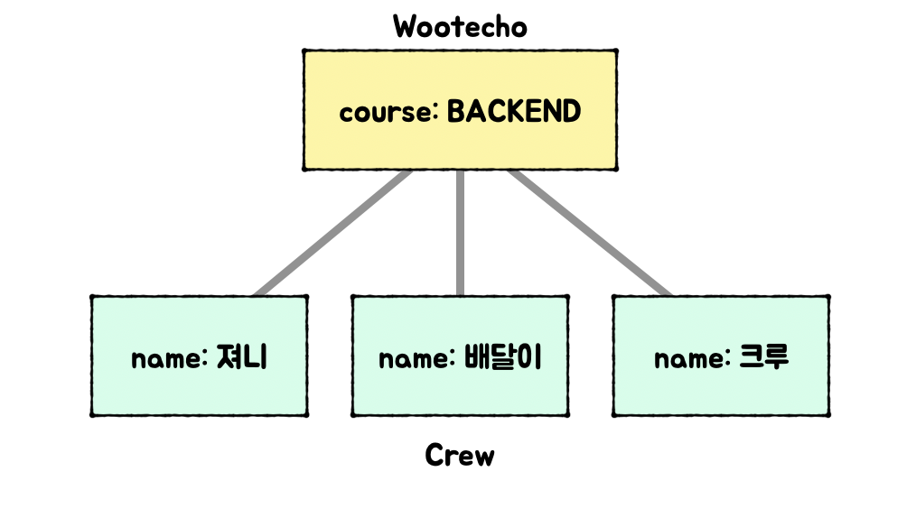 crew ํ ์ด๋ธ์ ๋จ์ํ wootecho_id๋ผ๋ ํ๋๋ฅผ ๊ฐ์ง๊ณ ์์ ๋ฟ์ด์ง, ์ธ๋ํค๋ก ๊ฑธ๋ ค์์ง ์๋ค.