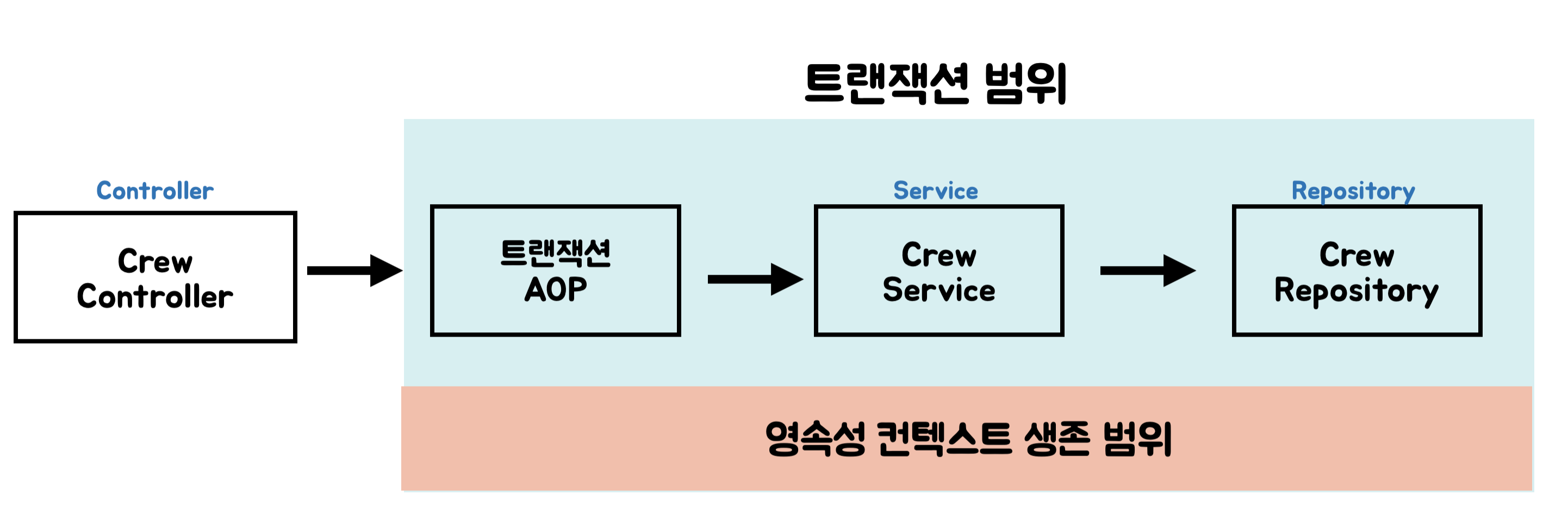 service ๋ ์ด์ด์์ ์กฐํํด์จ Crew ์ํฐํฐ๋ '์์ ์ํ'์์ผ๋, controller ๋ ์ด์ด๋ก ๋์ด์ค๋ฉด์ ์์์ฑ ์ปจํ ์คํธ๊ฐ ์ ๊ฑฐ๋์ด Crew ์ํฐํฐ๋ ์ค์์ ์ํ์ ์ํฐํฐ๊ฐ ๋์๋ค.