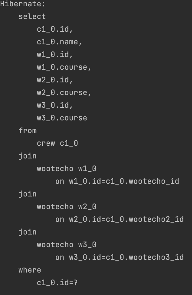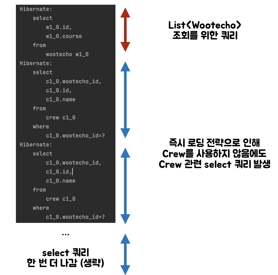 ์์ ๊ฐ์ด Wootecho๋ง ์กฐํํ๋ ค๊ณ ํ์ผ๋, ์ฆ์ ๋ก๋ฉ์ผ๋ก ์ธํด Crew์ ๋ํ ์ ๋ณด๋ ๊ฐ์ ธ์ค๋ฉด์ 1+N๊ฐ์ ์ฟผ๋ฆฌ๊ฐ ๋ฐ์ํ ๊ฒ์ด๋ค.