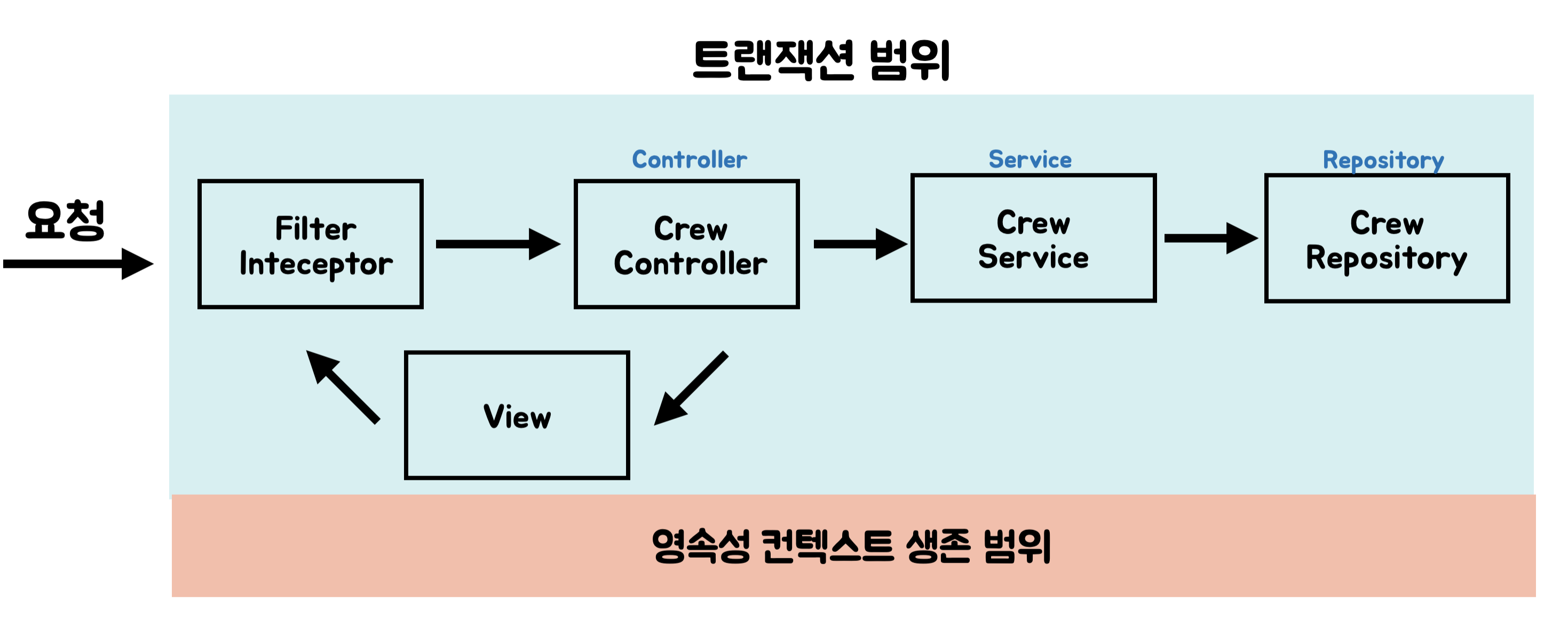 ํด๋ผ์ด์ธํธ ์์ฒญ์ด ๋ค์ด์ค๋ฉด ์๋ธ๋ฆฟ ํํฐ๋ ์คํ๋ง ํํฐ์์ ์์์ฑ ์ปจํ ์คํธ๋ฅผ ์์ฑํ์ง๋ง, ํธ๋์ญ์ ์ ์์ํ์ง ์๋๋ค.