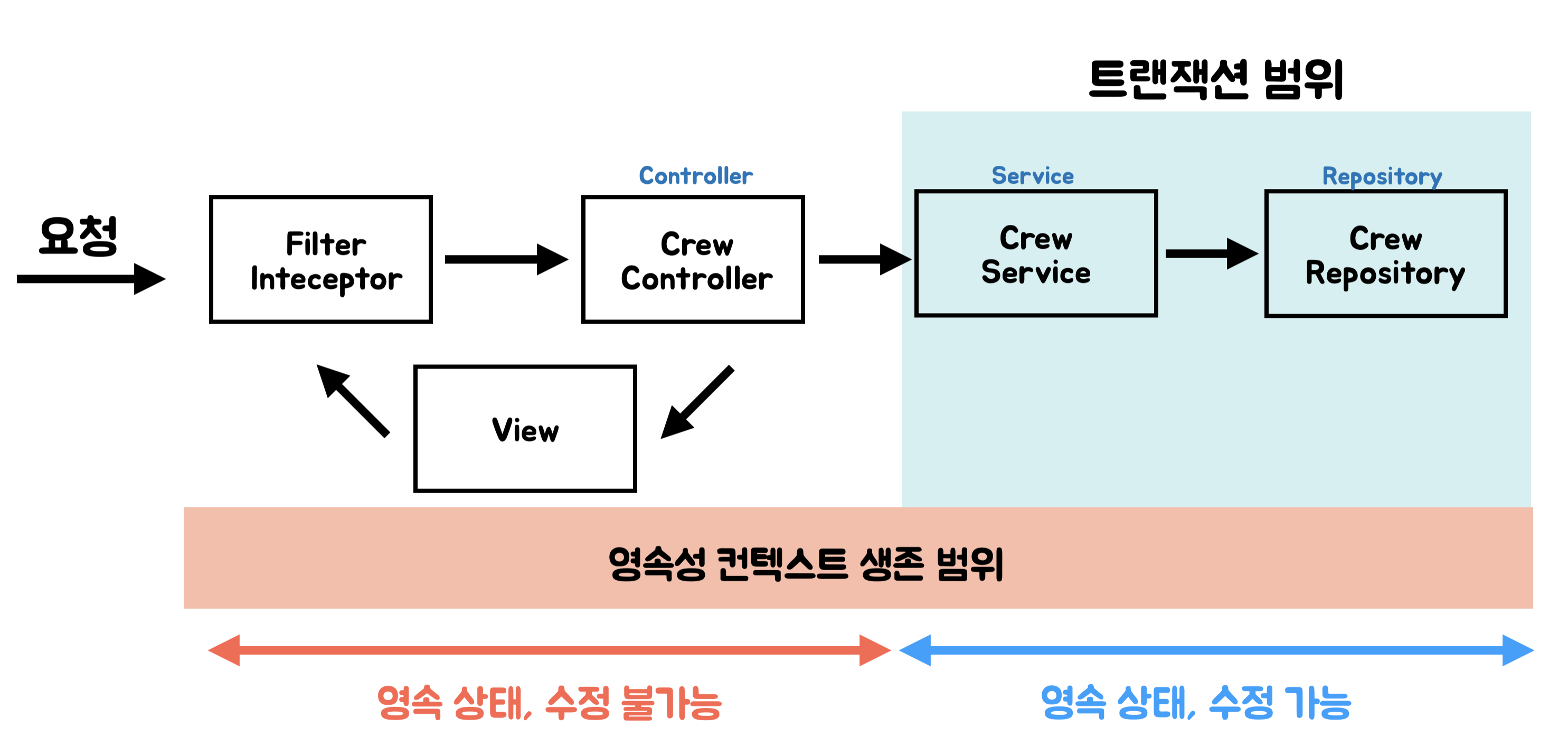 โญ๏ธ ๊ธฐ์กด์ ๋ฐฉ๋ฒ์ ๋นํด ํ๋ ์ ํ ์ด์ ๊ณ์ธต์์๋ ํธ๋์ญ์ ์ด ์๊ธฐ ๋๋ฌธ์ ์ํฐํฐ์ ๋ํ ๋ณ๊ฒฝ์ด ๋ถ๊ฐ๋ฅํ๋ค.